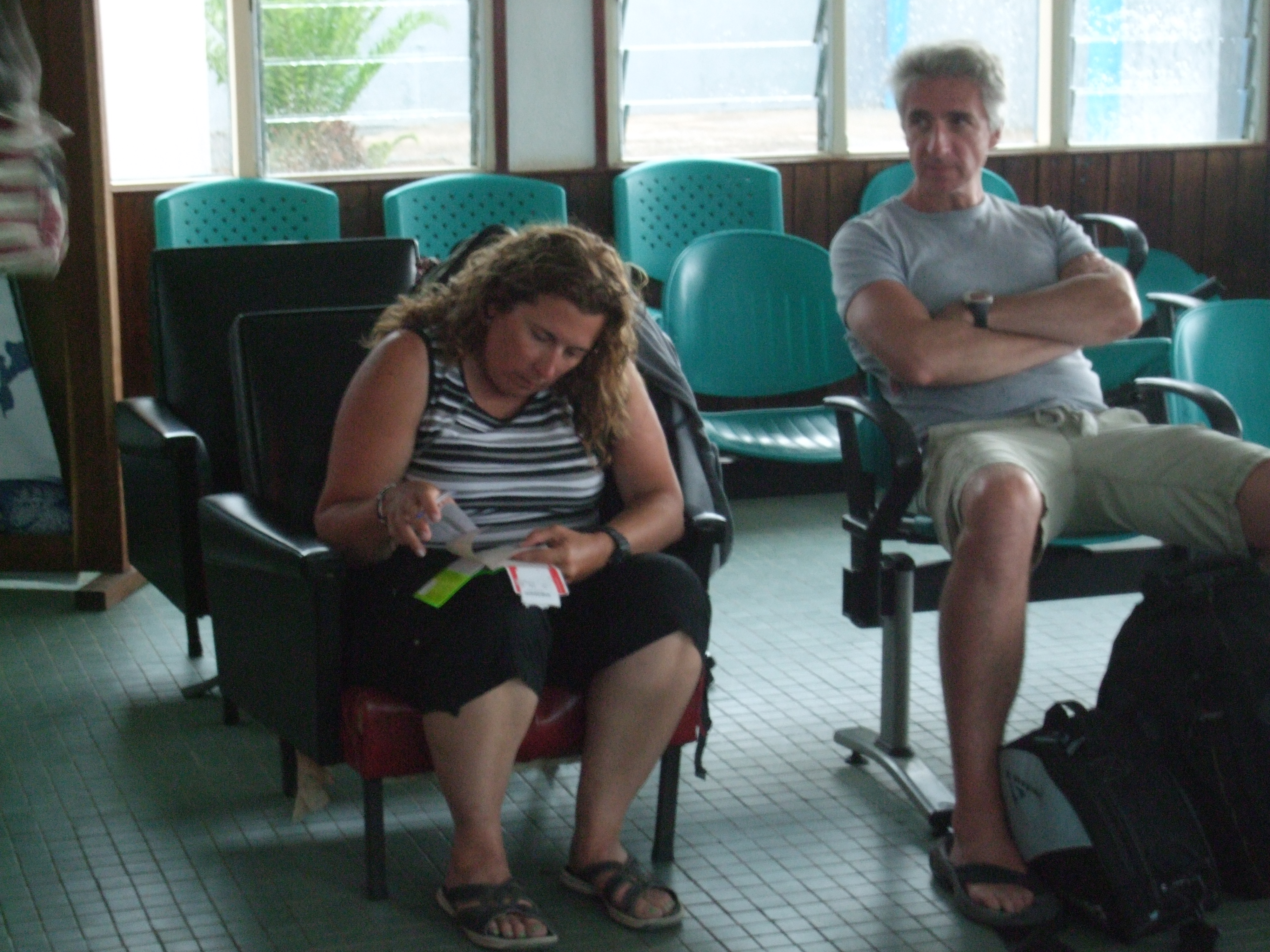 At the airport, weather was still ok at this point. Katherine with Jürgen a fellow Liquid diver and his wife on the same flight out of dodge.